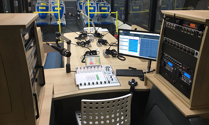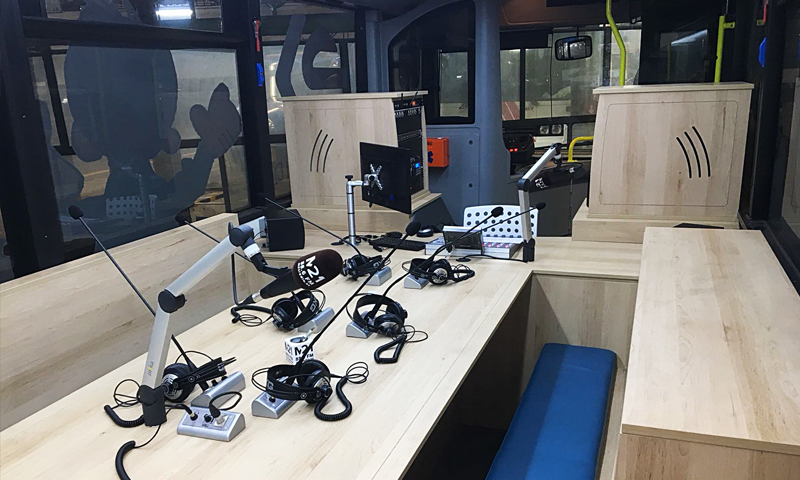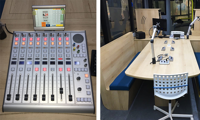 Nuestra experiencia en instalaciones de Unidades Móviles de Radio, es amplia y abarca desde pequeños vehículos adaptados a la transmisión de programas, hasta unidades móviles sobre vehículos de gran tonelaje (trailers), así como de estudios móviles realizados sobre furgonetas y vehículos especiales todo terreno. Este proyecto ha resultado especial porque ha sido la primera ocasión que hemos equipado un estudio de radio completo en un autobús. De ésta manera, M-21 cuenta con un estudio móvil que les permite la realización de programas en cualquier lugar.
